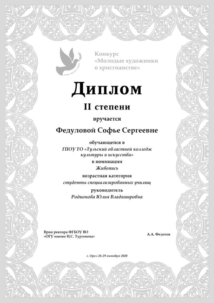 28-29 октября 2020 года в Орловском государственном университете имени И.С. Тургенева состоялся дистанционный творческий конкурс «Молодые художники о христианстве». Мероприятие проходило в рамках Всероссийской научно-практической онлайн-конференции студентов, аспирантов и молодых ученых «Архитектурно-культурное наследие русского православия как фактор сохранения исторической памяти и воспитания духовно-нравственных ценностей».