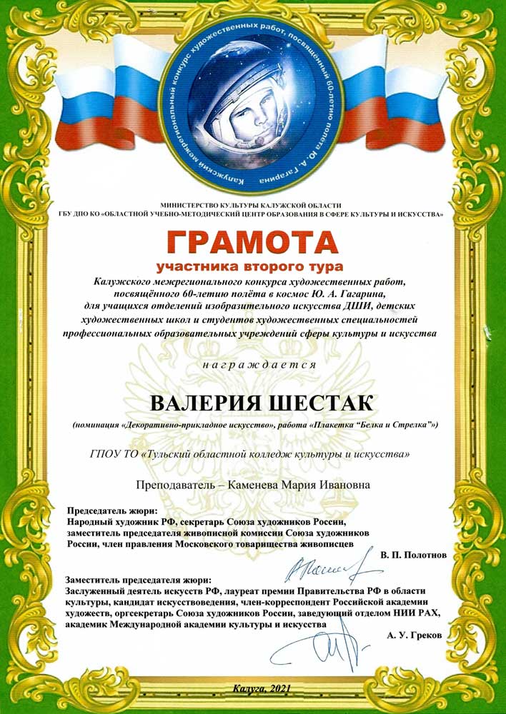 - грамота участника второго тура в номинации «Декоративно-прикладное искусство» – Шестак Валерия, работа: плакетка «Белка и Стрелка».