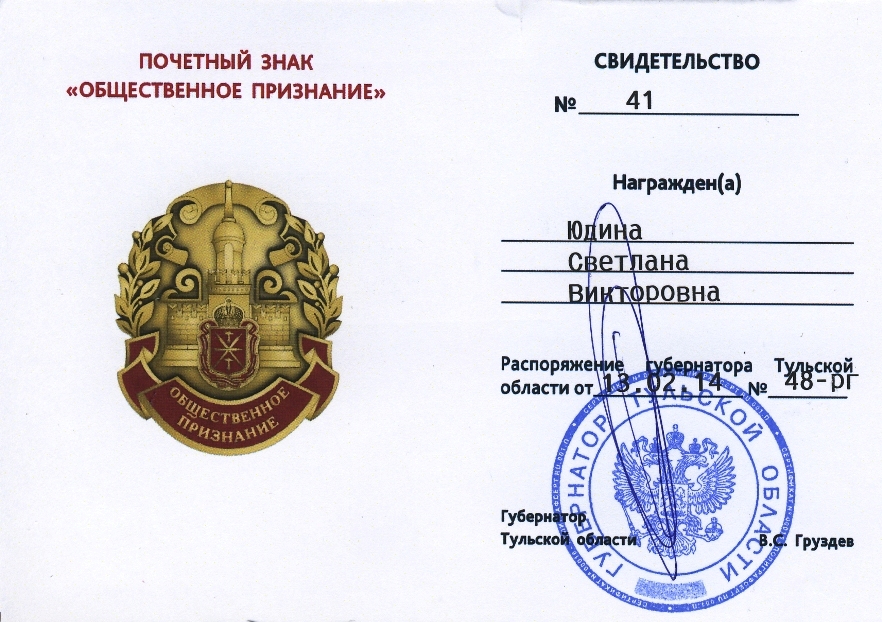 Присуждение почетного знака «Общественное признание» директору Тульского областного колледжа культуры и искусства Юдиной Светлане Викторовне – яркое подтверждение общественного признания учебного заведения.