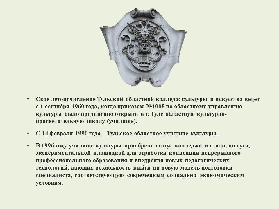 В нашем колледже выросло не одно поколение высокопрофессиональных кадров, составивших цвет ведущих творческих коллективов, учреждений культуры и образовательных структур Тульской области. Сохраняя лучшие традиции учебного заведения, Юдина Светлана Викторовна является инициатором и проводником инновационных идей в системе подготовки новой генерации работников культуры. Тульский областной колледж культуры и искусства всегда ответственно подходит к выполнению государственного задания по количеству студентов и сохранности контингента, привлекая профессионально-ориентированных абитуриентов. В ТОККиИ разработана и внедрена система менеджмента качества и активно реализуются образовательные программы согласно ФГОС СПО.